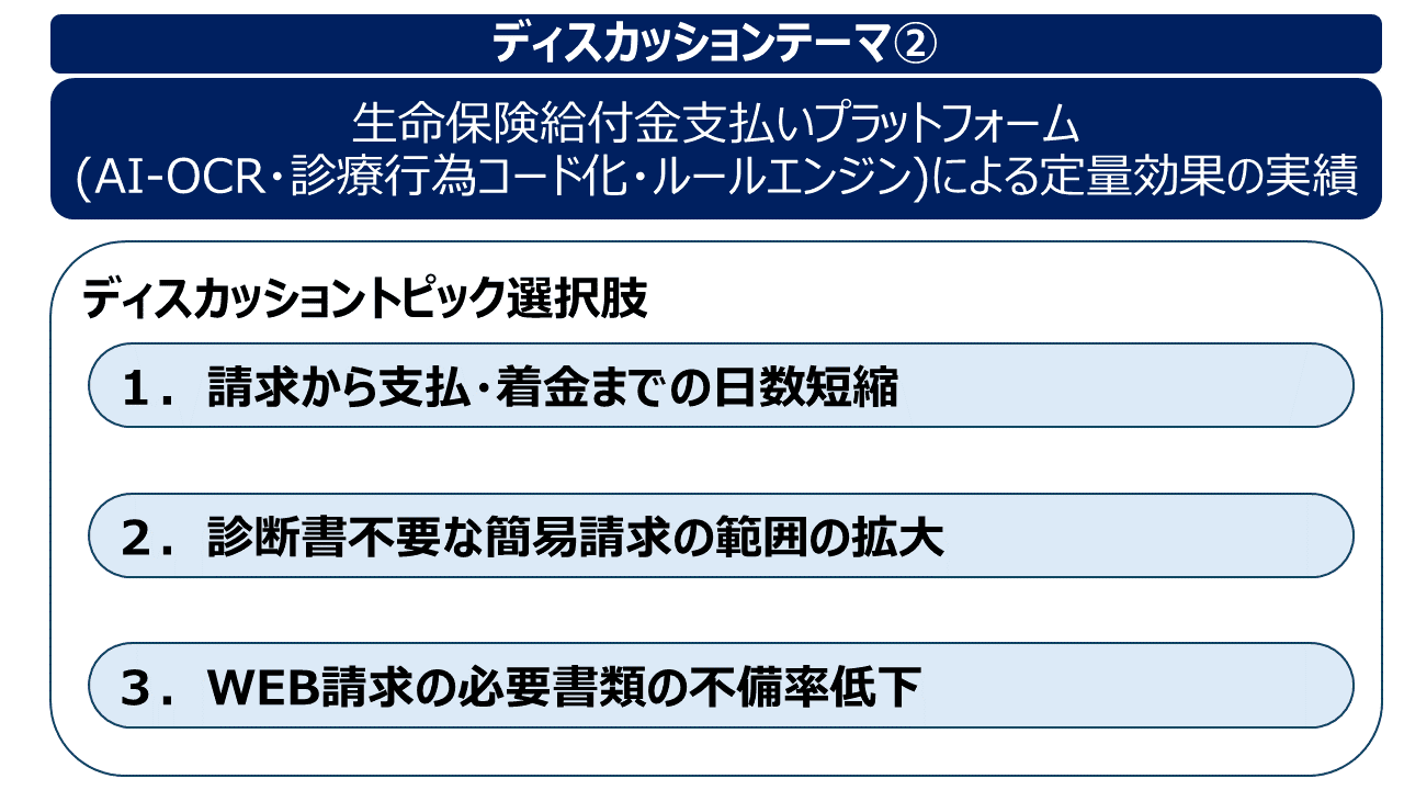 なおアイリックコーポレーションさんのプレゼンテーションでも説明がありましたが、生命保険給付金支払いプラットフォームで採用しているAI-OCRは、読み取り枚数が増えれば増えるほどボリュームディスカウントが効き、プラットフォームそのものも安価に利用できるようになります。そのためぜひ多くの企業様に生命保険給付金支払いプラットフォームのエコシステムに参画いただき、コストメリットを享受してもらえれば幸いです。