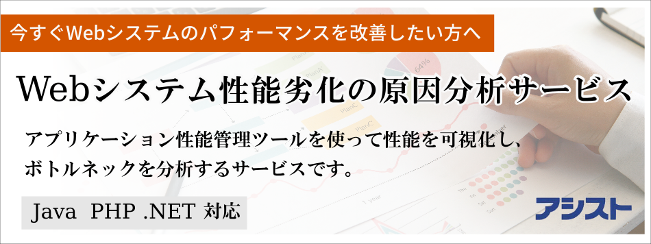 ECサイトのレスポンスが遅い、社内システムのパフォーマンスが劣化してきている・・・。そして、すぐに改善が必要だが、原因特定をする時間が無い、人手が足りない、アプリケーションがブラックボックス化していて、わかる人がいない・・・。そのような課題をお持ちではありませんか?アシストでは、今すぐにWebシステムの性能改善が必要な方向けに、Webシステムの今の性能を可視化し、性能劣化の原因を分析するサービスを始めました。