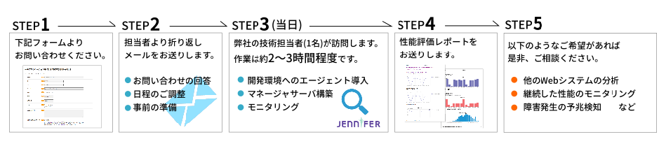 今すぐにWebシステムの性能劣化原因を特定しなくてはいけないが、人手が足りずにできない、わかる人がいない、などで調査できずにいるお客様向けに提供しているサービスです。具体的なサービス内容は、アプリケーション性能管理(APM)ツールJENNIFERのトライアル版をお客様のWebアプリケーションサーバにインストールしてWebシステムの性能を可視化し、性能劣化の原因を調査します。