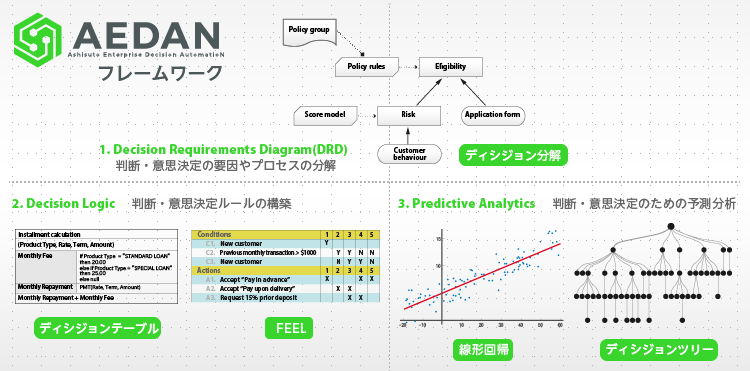 AEDANフレームワークは、標準化団体OMGの提唱するDMN(Decision Model and Notation)をベースとしたプロセスとディシジョンを正確に分離するモデリング技法で、モデルはそのまま「AEDANソリューション」で実装でき、ディシジョン・インテリジェンスを実現するものです。