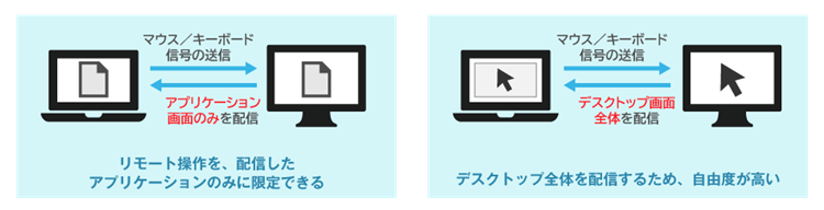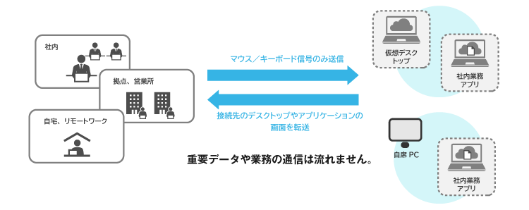 いずれも場合でも、ネットワークを介してデスクトップまたはアプリケーションの画面のみを表示するため、端末にデータが保存されず情報漏洩対策としても効果的です。