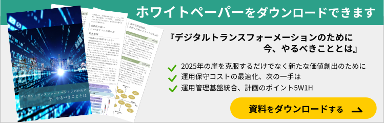 "デジタルトランスフォーメーション推進のために、運用部門が「今」やるべきこと"について、図解を交え、ホワイトペーパーにまとめました。Webページでは未公開の「運用管理基盤統合の企画・計画のポイント(5W1H)」なども掲載しています。お気軽にダウンロードしてください。