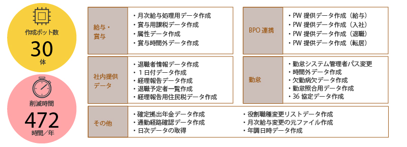 RPAの取り組み開始から半年経ち、下図のような業務を対象に作成した処理数は約30本になりました。その結果、人手で年間 約472時間かけていた作業が対象業務から解放され、空いた時間を企画検討に充てることができるようになりました。 |