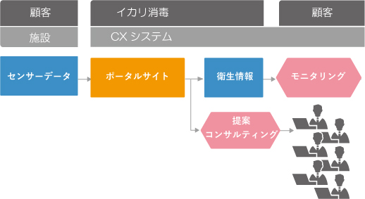 イカリ消毒様では業界初の仕組みとして、IoTを活用して有害生物をリアルタイムに監視し、24時間体制で一元管理する次世代型のオンライン環境衛生システム「CXシステム