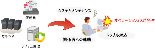 作業量が増加すると、作業を行う実担当者のみならず、作業をチェックする担当者の作業量も増加します。そして、一人一人の負担が増加すると「うっかりデータを削除した」「手順を間違えた」などのオペレーションミスを招くことになります。オペレーションミスによって業務遅延やサービスの不具合が発生してしまったら、IT運用に求められる「コスト削減」という命題から遠ざかることも否めません。