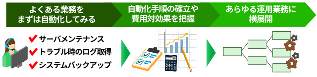 部分的な自動化は、初めに棚卸からスタートするのではなく、「よくある運用業務」をいくつかピックアップし、まずは自動化してみる、という進め方です。自動化までの手順の確立や、費用対効果の把握ができ、ゆくゆくはあらゆる運用業務へのスムーズな横展開が可能だと考えます。