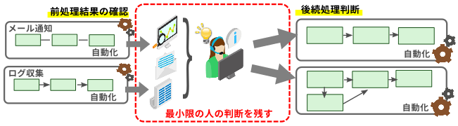 段階的な自動化とは、最小限の人の判断を残して自動化することです。例えば、運用業務には、単純にフロー化できるものばかりでなく、複数の要素を総合的に確認して、後続の処理を判断する業務もあります。それらの複雑なフローを全自動化しようとすると、すべての処理パターンの洗い出しが必要になり非常に工数がかかります。そこで、「複数の要素を総合的に見て、後続の処理を判断する」部分は人が行い、前処理や後続処理そのものは自動化します。