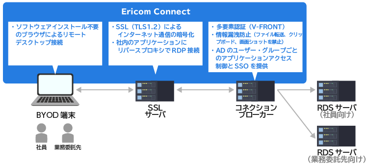 Ericomは、どこでも・どんなデバイスからでもWindowsデスクトップやアプリケーションへのセキュアなアクセスを可能にします。高価なVDIの代替、多様な端末からの業務アプリケーション利用、ISVによるWindowsアプリケーションのサービス提供、VPNを使わずにブラウザから社内の業務環境にアクセスしてテレワークといった用途に利用できます。