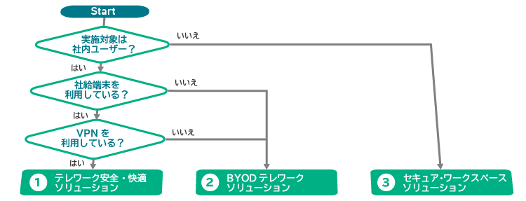以下の簡単なフローチャートで、目的や用途に最適なソリューションを確認いただけます。