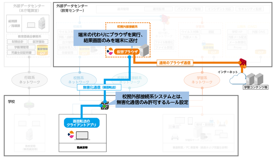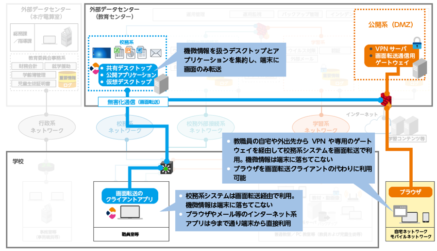 - ※2画面転送プロトコルを用いてリモート(校務外部接続系システム)のデスクトップやブラウザを校務系システムの端末から利用する(通信の無害化)ことと、インターネットメールの添付ファイルの削除やHTMLメールをテキストデータ化することによって校務系システムで閲覧可能にすること(メール無害化)の総称。