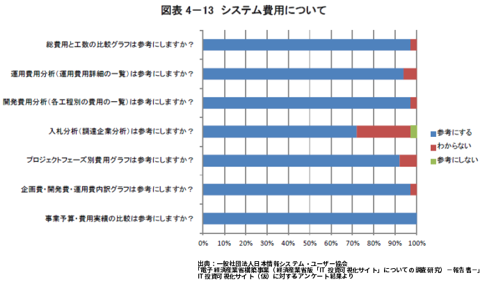 平成25年に経済産業省が実施した"「IT投資可視化サイト」についての調査研究"では「IT投資可視化サイト(仮)に対するアンケート結果」として、費用分析結果に対するユーザの関心がいずれも90%以上と非常に高いことがわかっています。しかし、同時にインプットデータとして正確に測定されている案件が多くないことが指摘されていました。