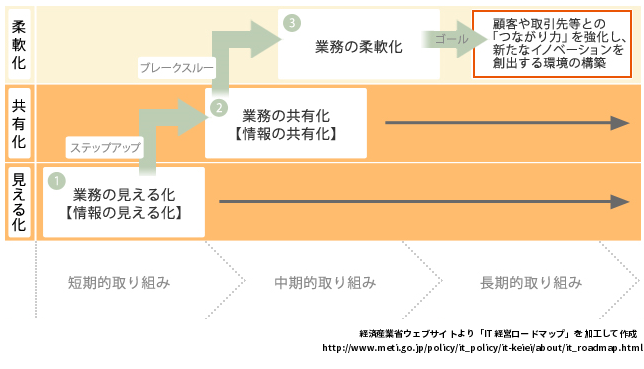 経済産業省のウェブサイトでは成功企業の経験を踏まえた、IT経営の実践に向けた取り組み「IT経営ロードマップ」の中で「情報の見える化」を、短期的に行う取り組みとして推奨しています。